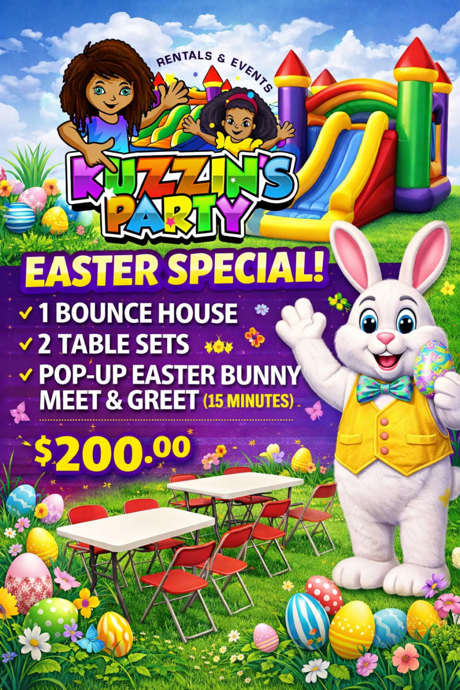 Don’t wait until the last minute. Our Easter Special is available now and spots are filling up fast. Book early to secure bounce houses, tables & chairs, popcorn and cotton candy machines, and more. Perfect for Easter parties, family gatherings, church events, and backyard celebrations. 🎉